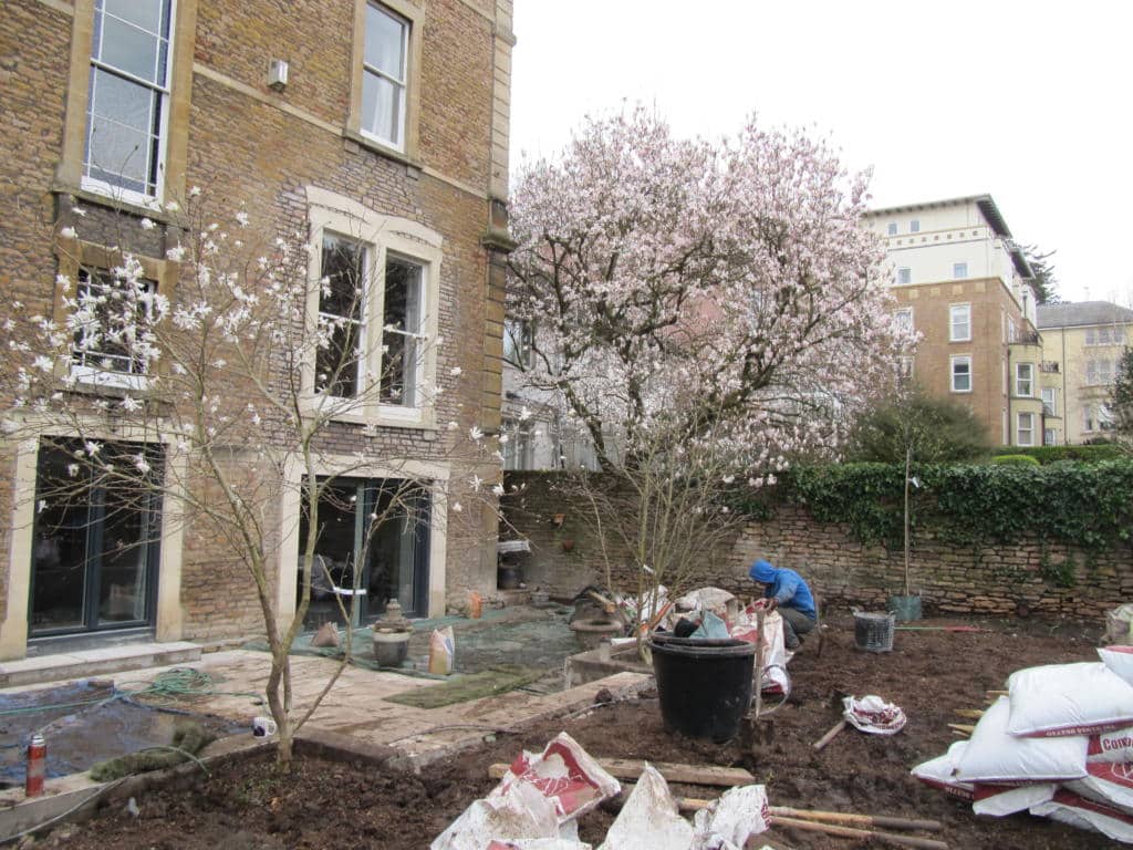 After the pear trees were planted we then got to work shifting two mature Magnolia trees into position. We placed them either side of the top of the steps. They look great against the backdrop of the wonderful Magnolia in the next-door garden.