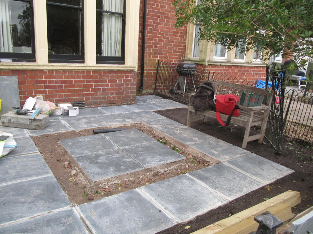 The square slate paving slabs were cut into a circle in the middle of the garden border. Top soil was brought in to fill up around this border and around the front and sides of the garden