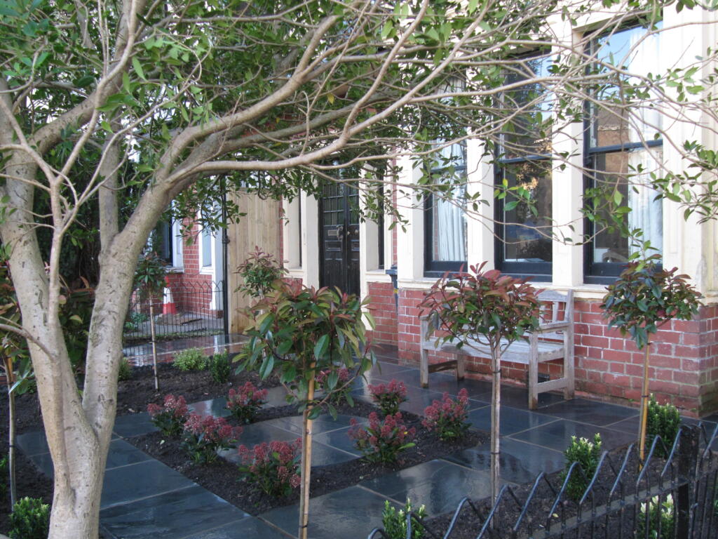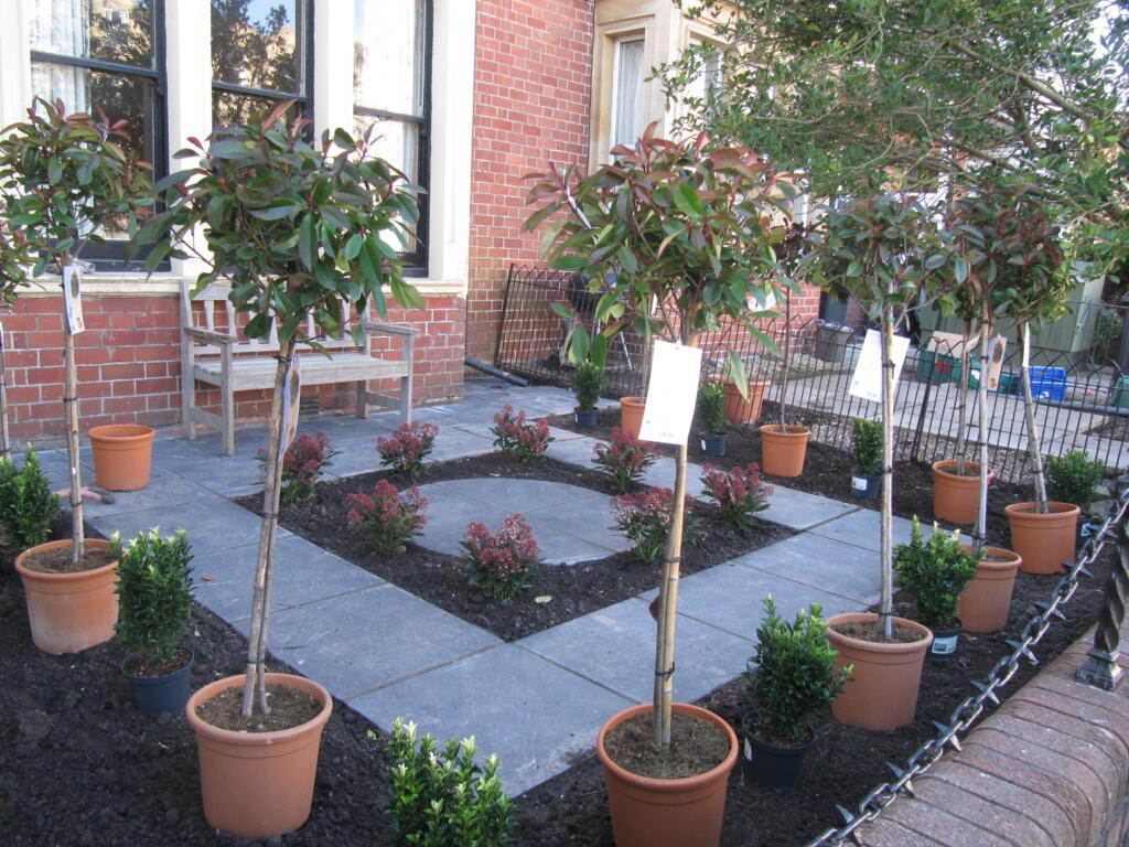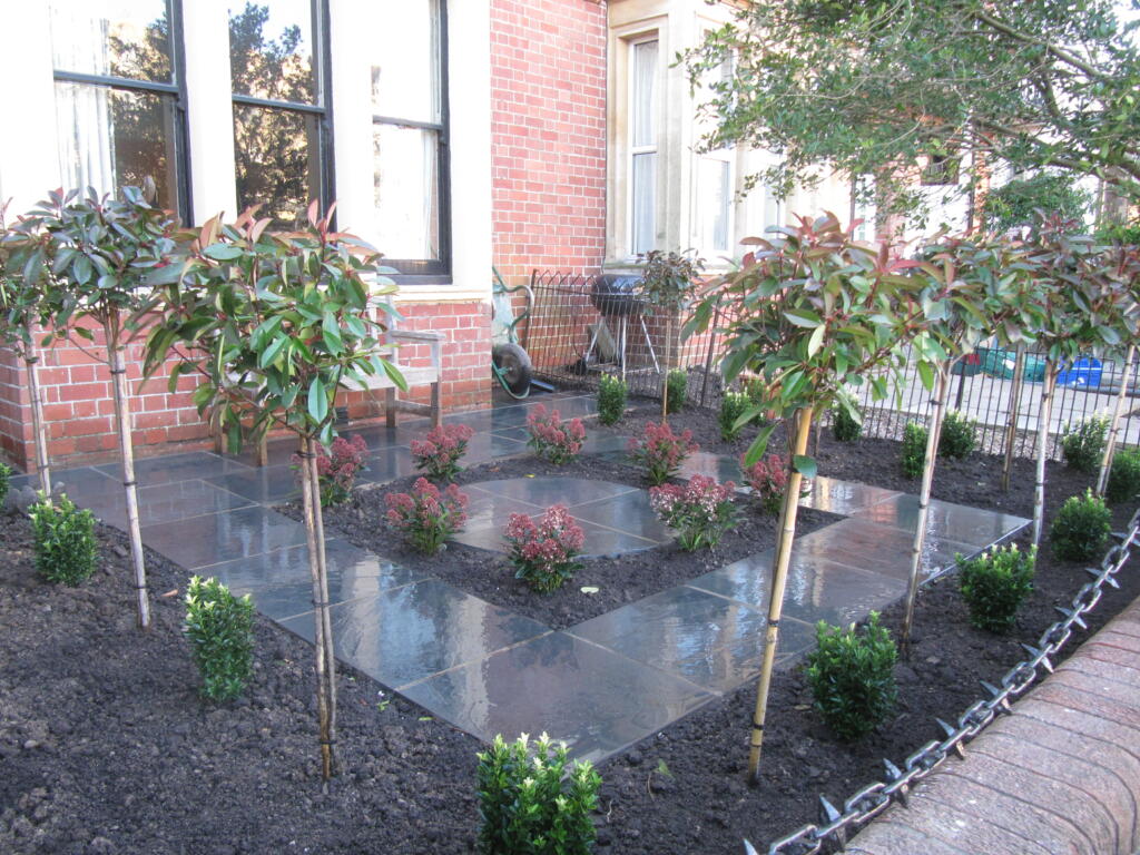 We then brought in half standard Photinia red robin’s to go around the squared paving, interspersed with Euonymus. The Euonymus will create a low hedge around the Photinia, which can be pruned to keep them compact.